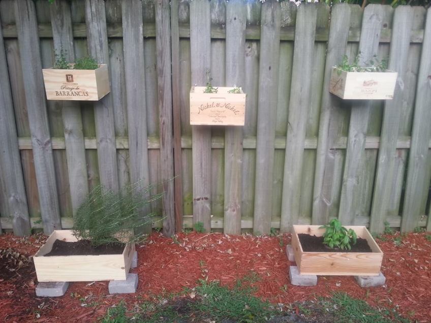 herbs 1 Published May 7, 2014 at 960 × 720 in Wine Crate Herb Garden Step 6: Unhook from wall once you’re happy with they way they look, fill with herbs then re-hang. Rather than hang the larger boxes, I elevated them on brick pavers so that they could drain.
