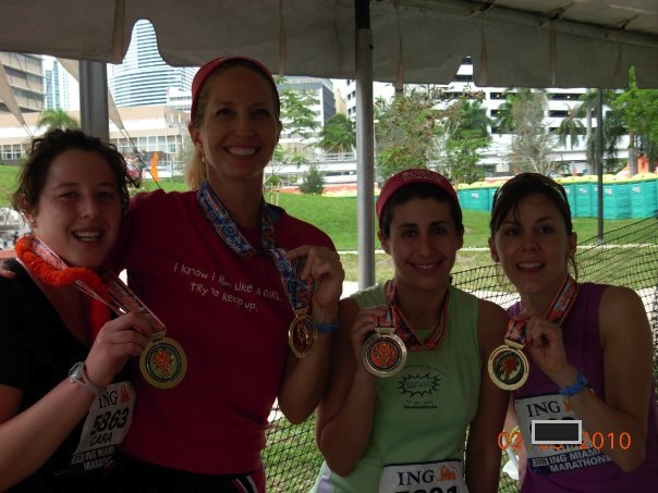 My friends Cara, Kris and I along with another running group member after having finished our first full marathon in 2010! (ING Miami)